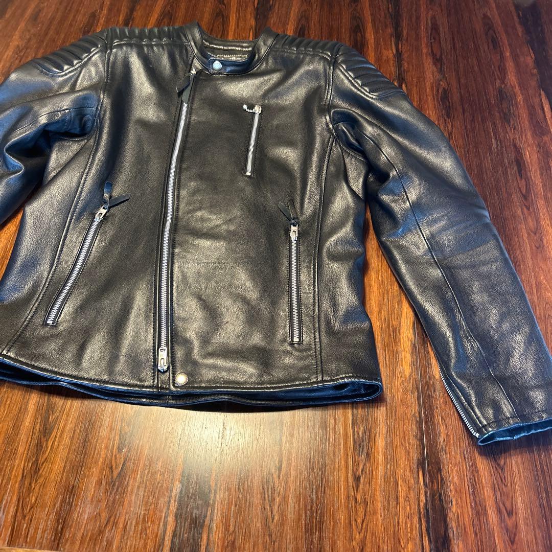 - 写真通り。いい買い物でした。177cm 73Kg 通常はLですがUSサイズの為、Mにしてみました。人より腕が長く、Yシャツ、スーツ 腕の長さが合わずいつも大変な思いをしている私ですが気持ち長めで意外にジャストでした。もしかしたらSでもいけるのか?非常に試着してみたいです。何はともあれカッコイイ一着ですよ。